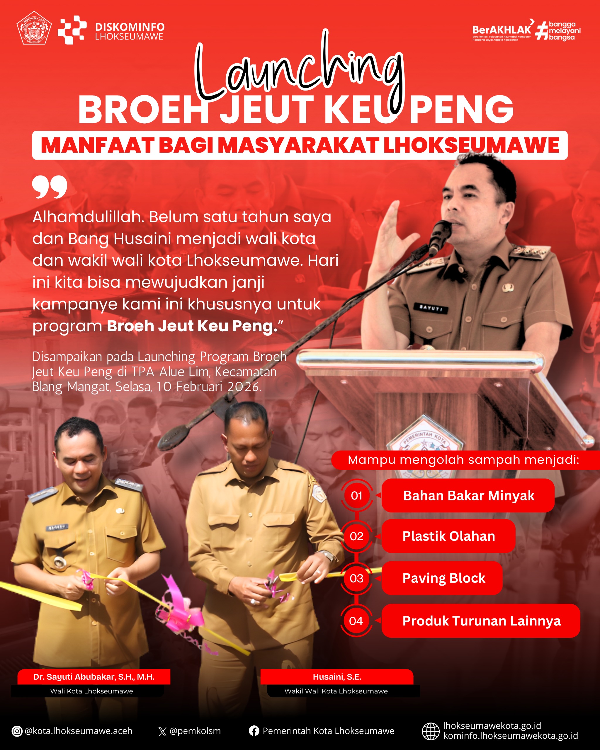 Pemerintah Kota Lhokseumawe resmi meluncurkan Program Broh Jeut Keu Peng (sampah jadi uang) dengan mengoperasikan mesin pengolahan sampah berbasis teknologi terbarukan di TPA Alue Lim, Kecamatan Blang…